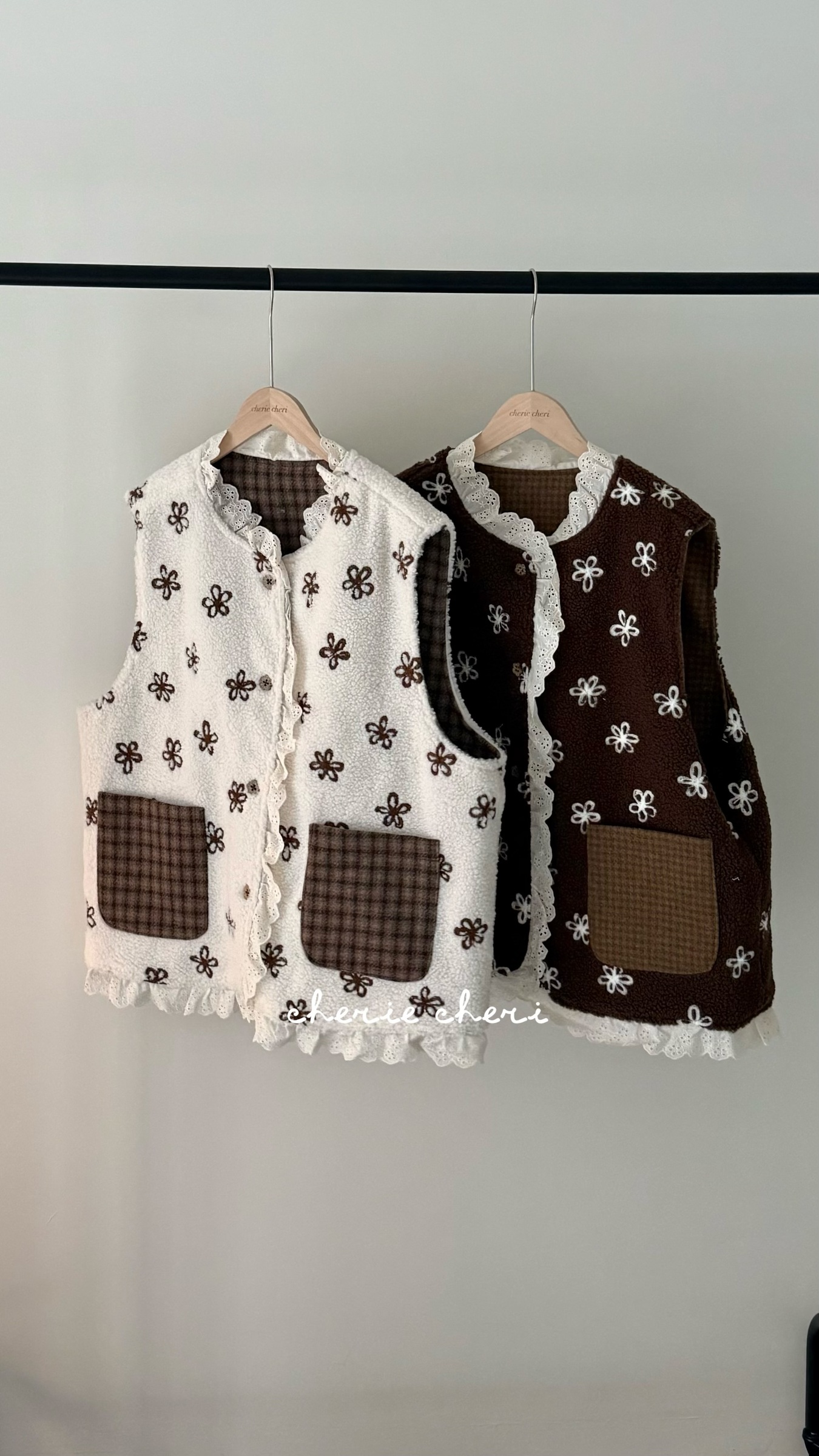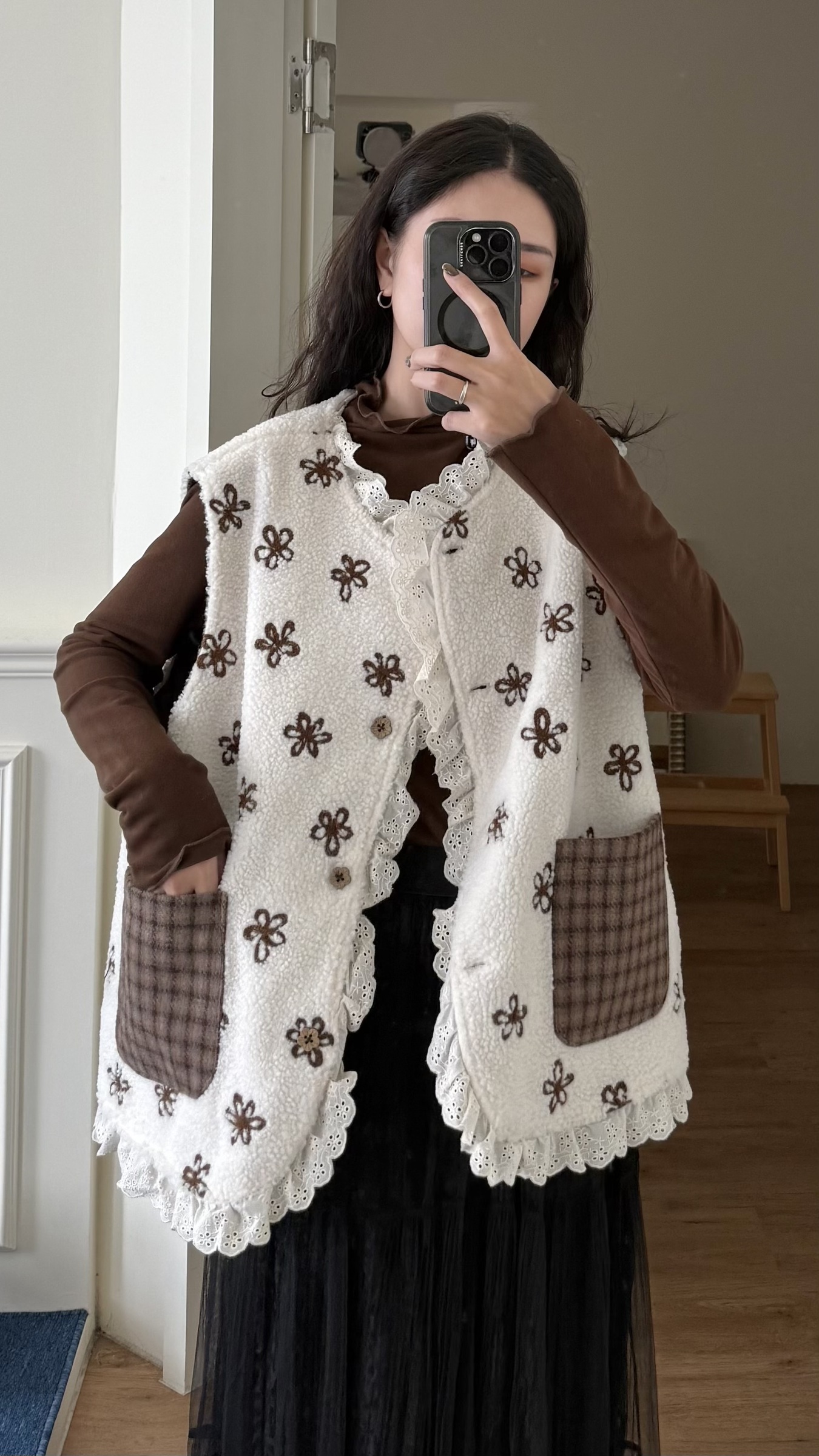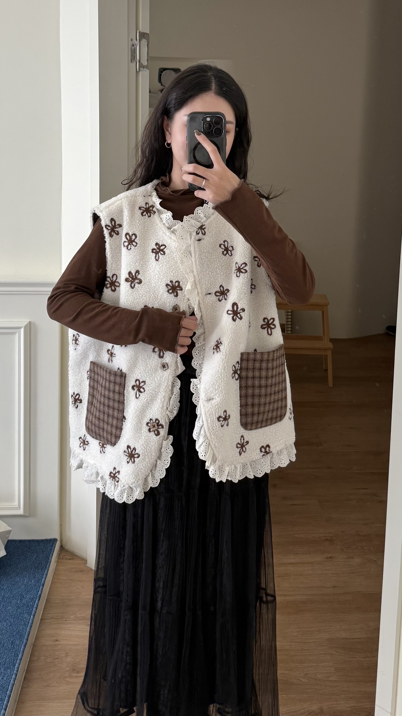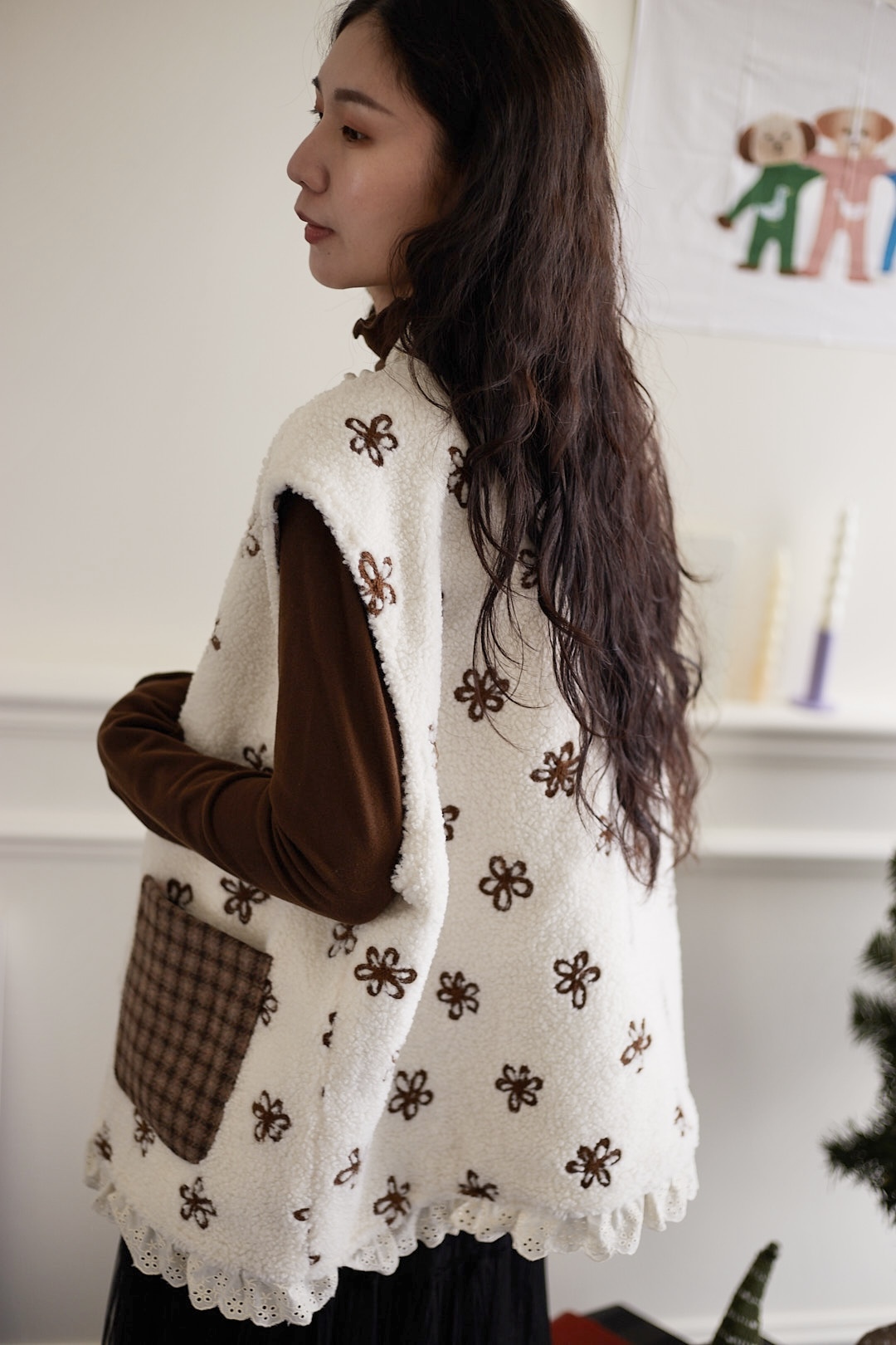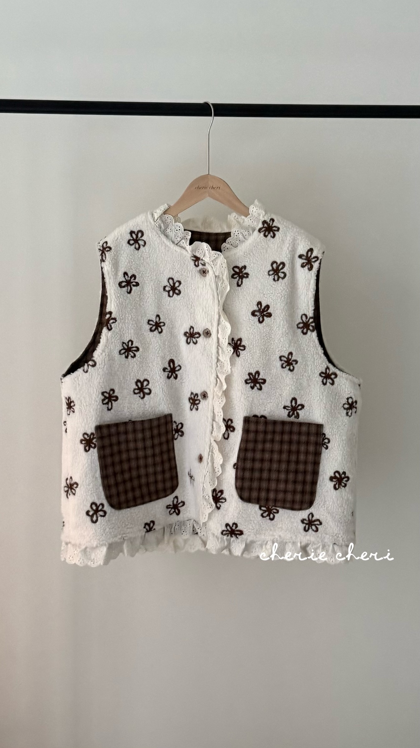 d110 必收!!花花羊羔毛蕾絲拼接背心 兩色