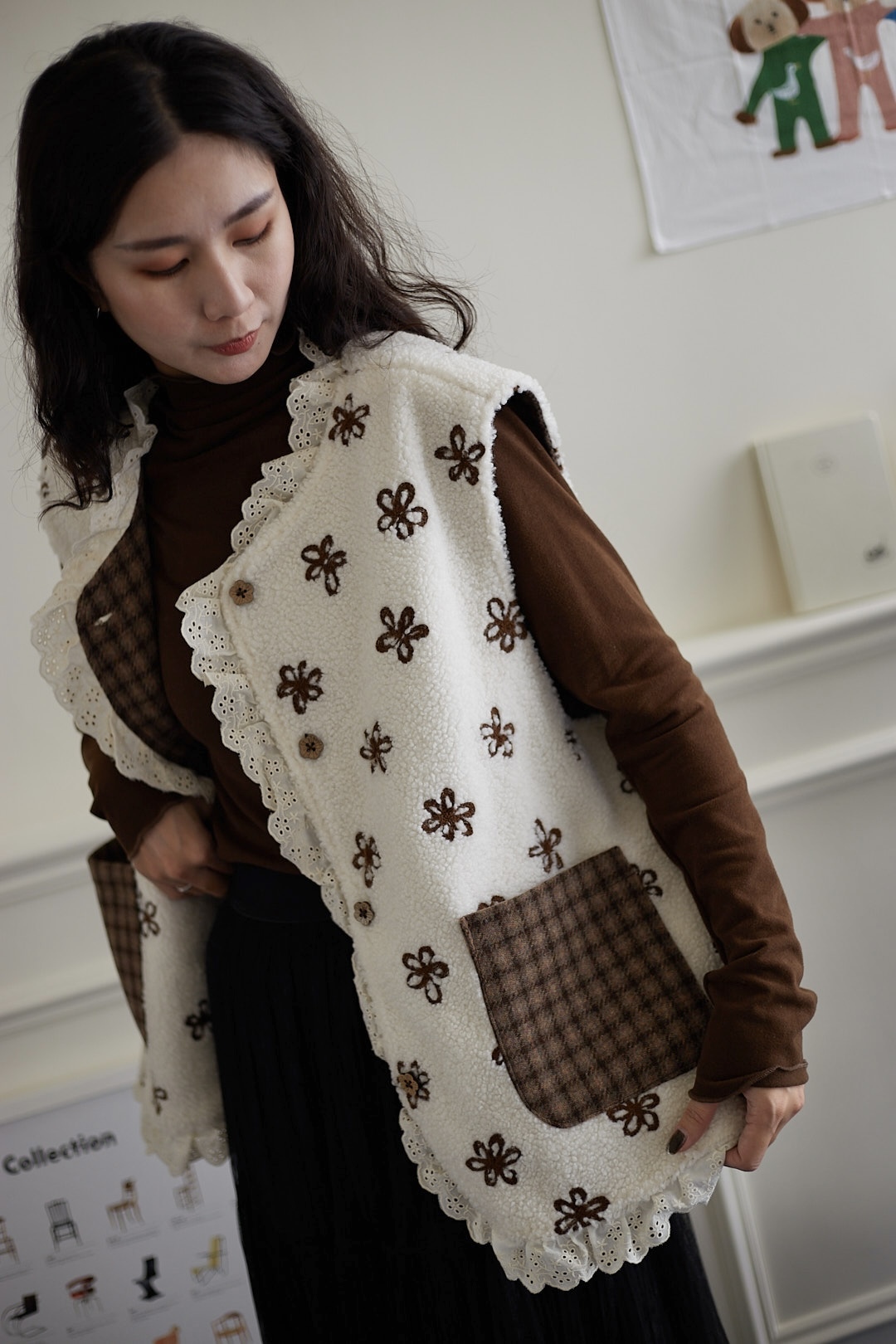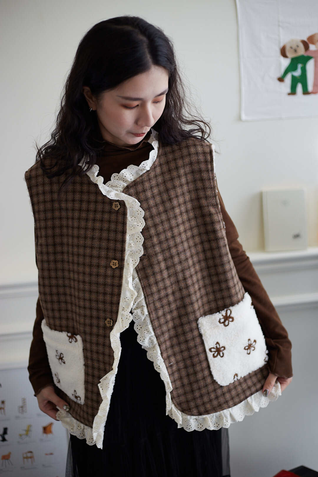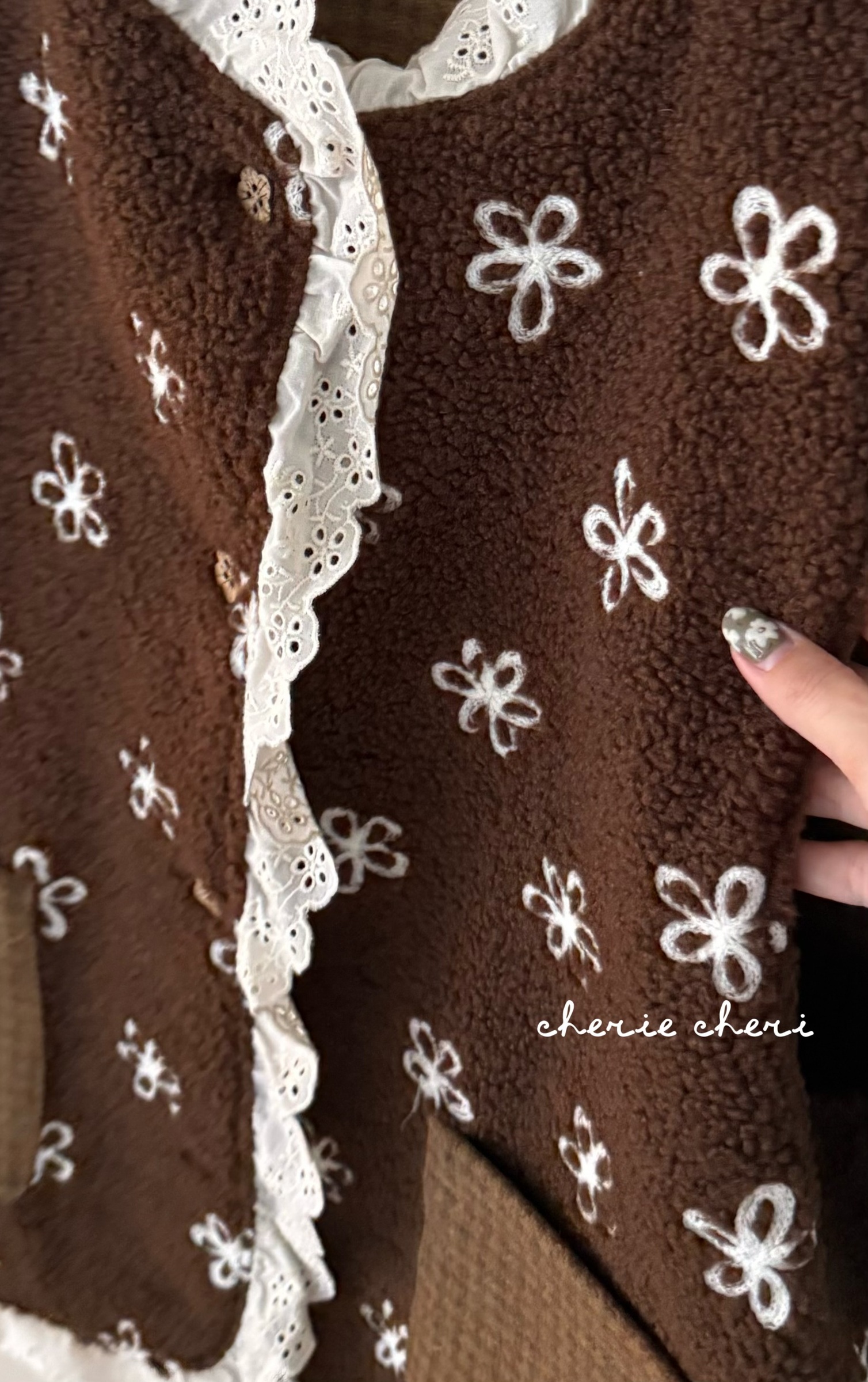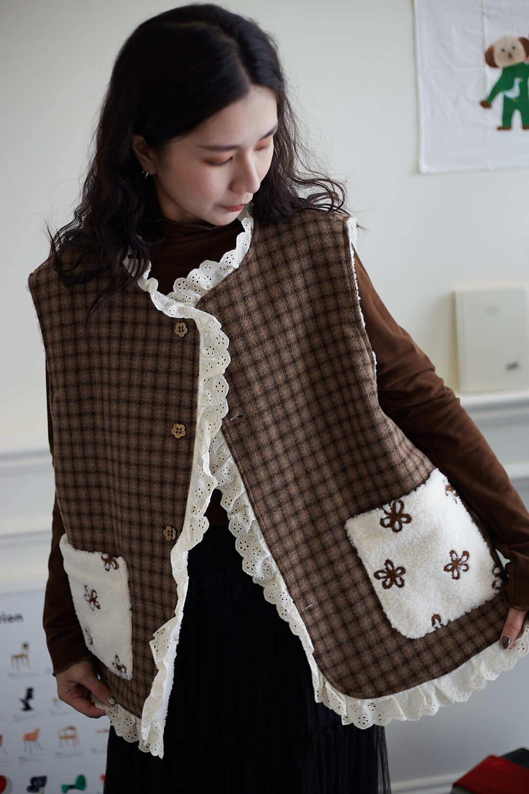 d110 必收!!花花羊羔毛蕾絲拼接背心 兩色