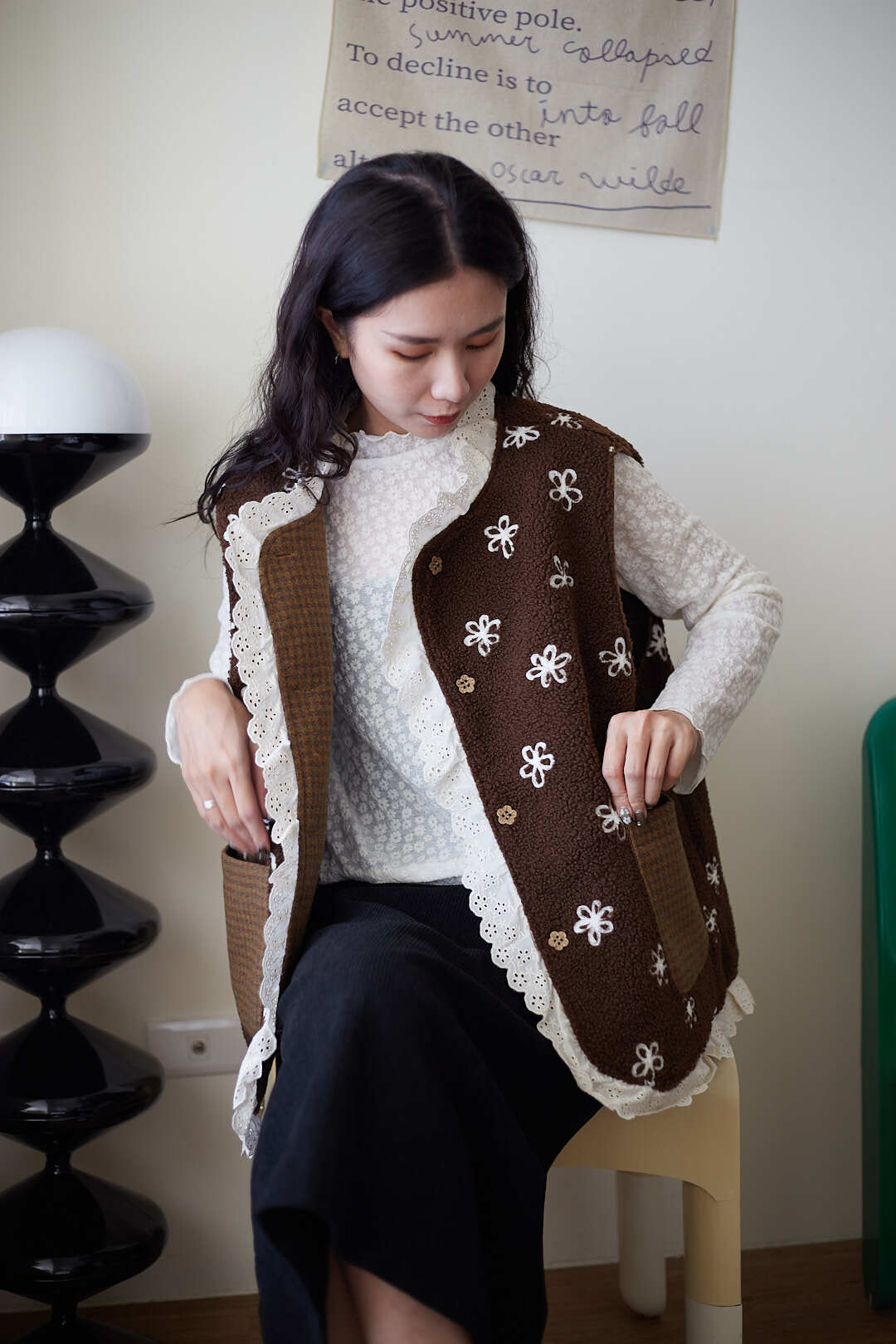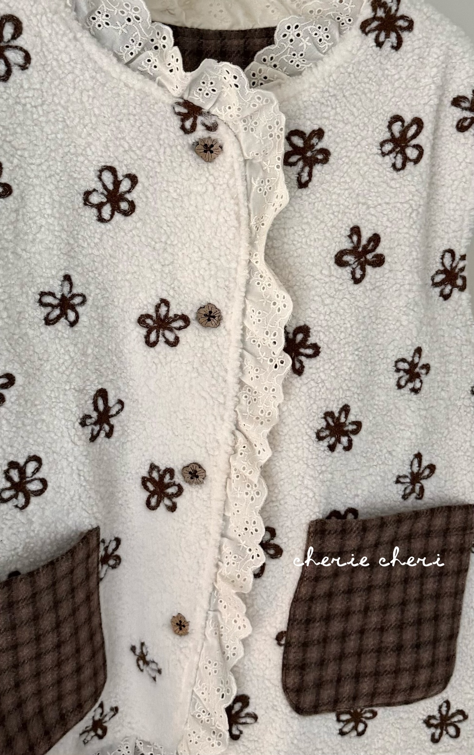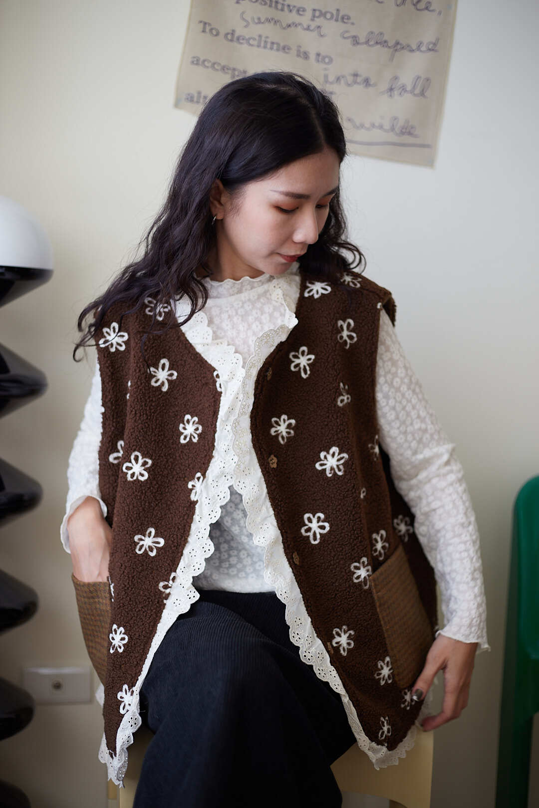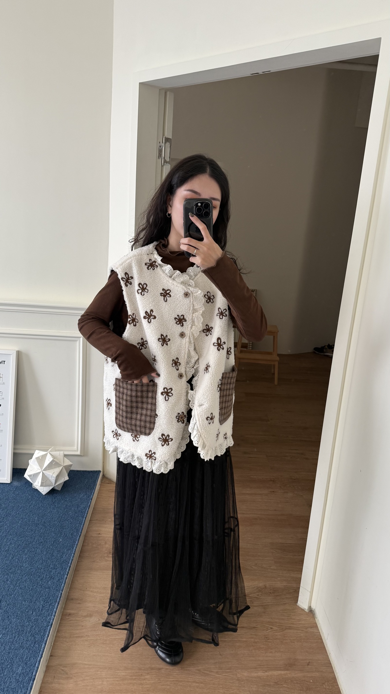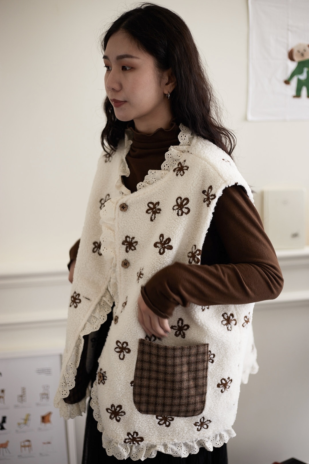 d110 必收!!花花羊羔毛蕾絲拼接背心 兩色